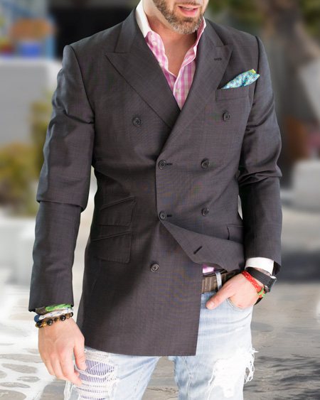 the Elkann style is a walking contradiction. The double-breasted style says formal, while the cotton/khaki fabric speaks casual.
